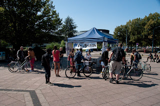 L'association vélostation organisait hier en marge de la brocante solidaire, un atelier mécanique à destination des étudiants sur le parvis de la fac de droit. L'occasion pour les nouveaux étudiants, les anciens ou pour les autres cyclistes de passage de faire réviser sa monture et de la réparer avec les conseils avisés des membres de l'association.