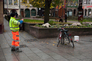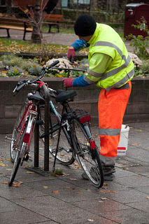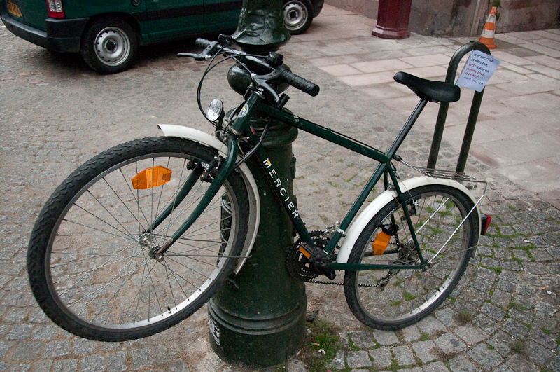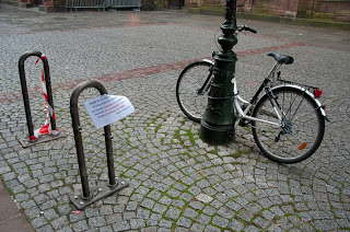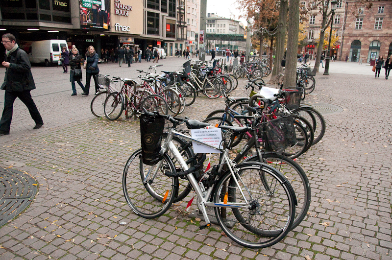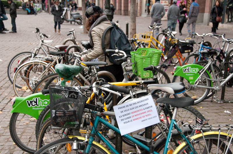 Afin de faire place nette aux touristes pour le marché de Noël, la ville de Strasbourg supprime temporairement depuis hier de nombreux arceaux vélos sur les places du Temple Neuf, Broglie, de la Cathédrale et des Tripiers. Depuis lundi et conformément à l'arrêté temporaire 2012-1213 qui stipule "qu'il importe de prendre des mesures restrictives en matières de circulation et de stationnement afin de garantir en toute sécurité, la mise en place sur les différents sites des chalets, ainsi que le bon déroulement du Marché de Noël", des messages indicatifs ont été installés sur chaque arceau concerné par cet arrêté. Jeudi, les premiers arceaux vides ont été enlevés. Hier, les arceaux ainsi que les vélos restant cadenassés dessus ont été déboulonnés par une entreprise spécialisée.