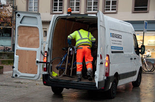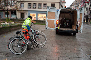Avant l’enlèvement des arceaux, l’entreprise prend en photo tous les vélos qui y restent attachés. Ils sont ensuite chargés dans une camionnette et emmenés au dépôt de l’entreprise situé au port du Rhin. Si ces vélos ne sont pas cherchés par leurs propriétaires, l’entreprise les réinstallera au même endroit lorsque les arceaux seront remis en place début janvier.