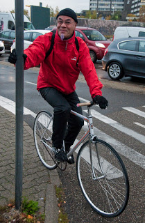 Parfois au détour d'une photo et d'un carrefour, une discussion s'engage... L'autre jour, c'était avec Bernard, cuisinier dans un restaurant. Depuis de nombreuses années, tous les matins avant de prendre son service, il fait une heure de pignon fixe dans les rues de Strasbourg. Pour cela, il dispose de deux vélos réalisés par ses soins. Celui présenté sur la photo dispose d’un cadre Peugeot datant des années 80 avec une fourche chromée d’origine. Il envoie du gros avec un braquet de 54*12. Le guidon est un manche de balais sur lequel il a monté un frein avant. Merci Bernard pour ces quelques mots et à très bientôt dans les rues de Strasbourg...