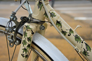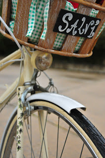 Salvi a acheté son vélo d’occasion puis l'a fait révisé par son frère féru de mécanique. Elle l’a ensuite décoré de feuilles de lierre peinte délicatement sur la fourche et sur la barre centrale du cadre afin de lui donner une touche plus personnelle et chaleureuse. Par la suite, Salvi souhaitait équiper son vélo de rangements pour y mettre son sac et des courses (notamment quelques bonnes bouteilles de vin...). Elle a trouvé dans une brocante une paire de sacoche et un panier (avec sa petite plaque d’immatriculation) qu'elle a ensuite retapé et adapté pour son vélo avec l'aide de sa belle sœur…