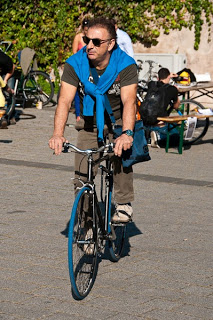Après le violet, on continue l'été en couleurs avec le bleu. Cette couleur se retrouve très souvent sur les cyclistes se soit pur une chemise, une veste, ou des chaussures. Il se rencontre également sur des accessoires qu'ils soient du vélo (pneus, sacoches...) ou de mode comme des petites lunettes rondes pour voir la vie bleu...