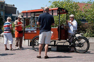 Ce triporteur propose des mets réalisés à partir de produits frais et locaux qui sont préparés par un chef chaque matin. Il a été spécialement réaménagé et équipé de compartiments froid et chaud, de quelques malicieux rangements ainsi que d’une petite plaque alimentée au gaz afin de faire revenir certaines préparations. Il pèse plus de 300 kg et pour un peu plus d'aisance, l’équipe du Resto’rue dispose d’une remorque équipée d’une assistance électrique (non présente sur les photos pour cause de panne).