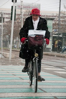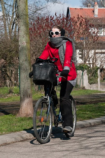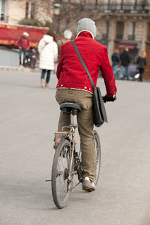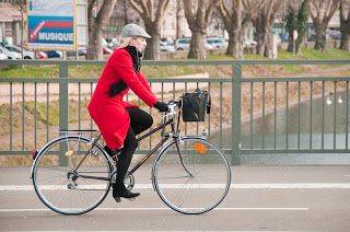 Moins ostentatoirement, le rouge peut s’accorder avec différents éléments comme des gants, un bonnet ou un chapeau et une écharpe qui peuvent même répéter la couleur du vélo…