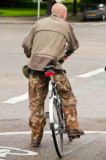 Le vélo est souvent qualifié de déplacement doux car il prend très peu de place, ne pollue pas et ne fait pas de bruit. On pourrait presque dire qu'il est «pacifique». Cela ne semble pas être l’avis de ces cyclistes surpris à Strasbourg et Copenhague qui revêtent des vestes, pantalons ou sac arborant le motif camouflage utilisé par les militaires…