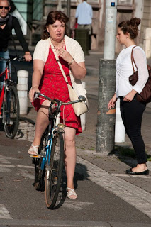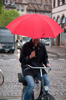 Voici le dernier message de la série « l’été en couleurs ». Il est consacré au rouge. Couleur la plus appréciée des cyclistes, elle se porte de deux manières différentes. Dans le premier cas les cyclistes strasbourgeois l’affiche clairement avec des vestes, des robes ou des accessoires comme un parapluie qui ne peuvent pas passer inaperçu.
