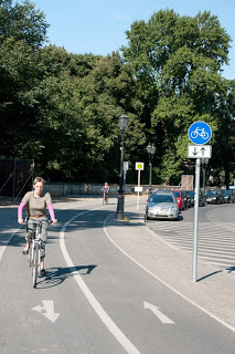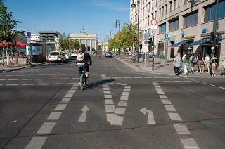 Les infrastructures cyclables sont très présentes sur les grands axes et se matérialisent par des pistes unidirectionnelles sur la chaussée ou sur le trottoir sur les axes récemment réaménagés. Je n'ai vu qu'une seule piste bidirectionnelle bien pensée autour du rond point de Großer Stern en plein milieu des 200 hectares du parc Tiergartern.