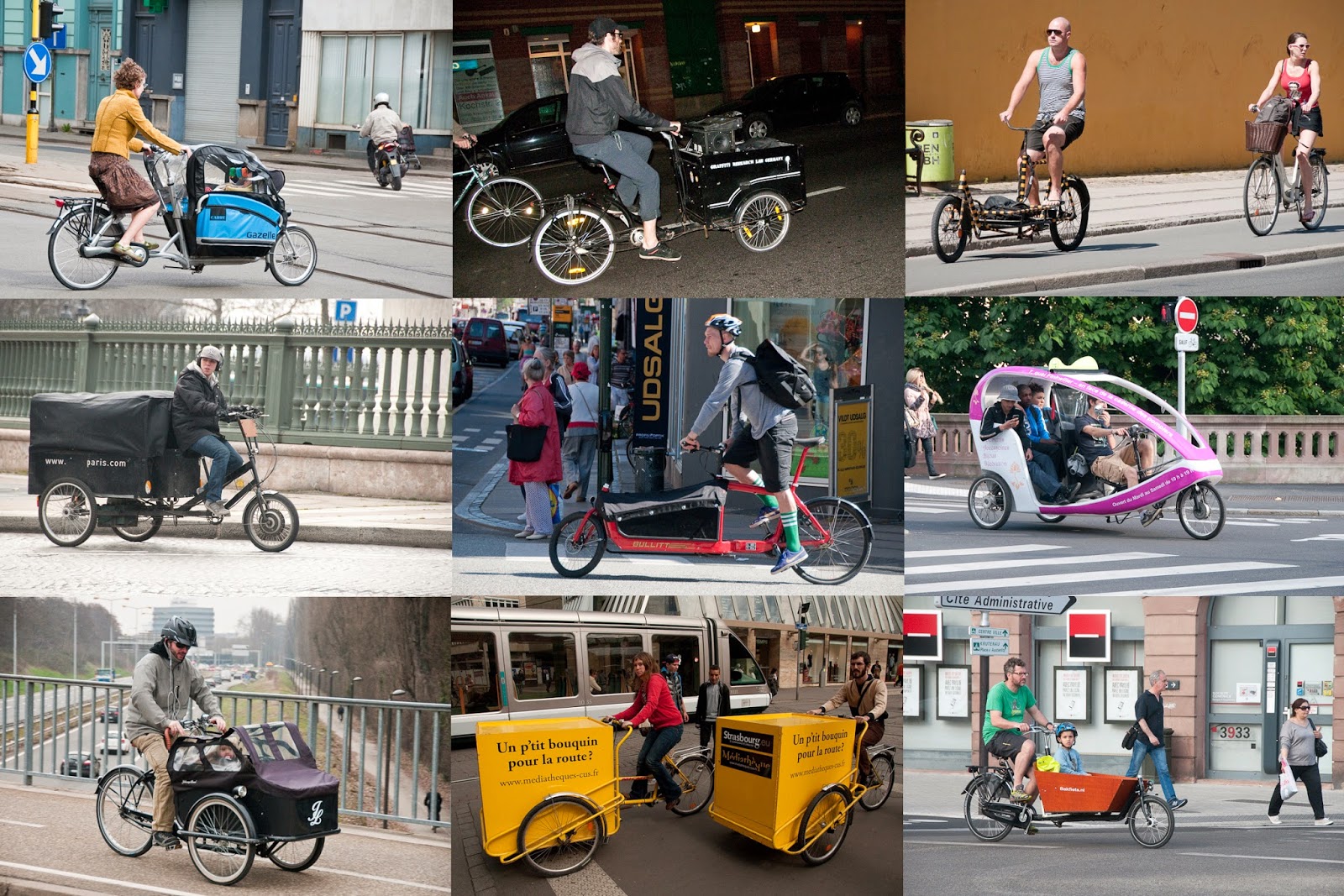 L'exposition lancera les festivités du meeting 2014 qui se déroulera le Dimanche 29 juin sur la pelouse de Reuilly dans le Bois de Vincennes. La sélection parmi les plus de 600 clichés de vélos cargo de ma collection a été très difficile. J’ai néanmoins réussi à retenir 20 photos (dont quelques inédites) représentatives de l’utilisation des vélos cargo dans les villes de Copenhague, Paris, Berlin, Gand et bien sur Strasbourg…Pour vous donner envie de venir, voici un petit aperçu de photos qui n’ont pas été retenues lors de cette cruelle sélection.