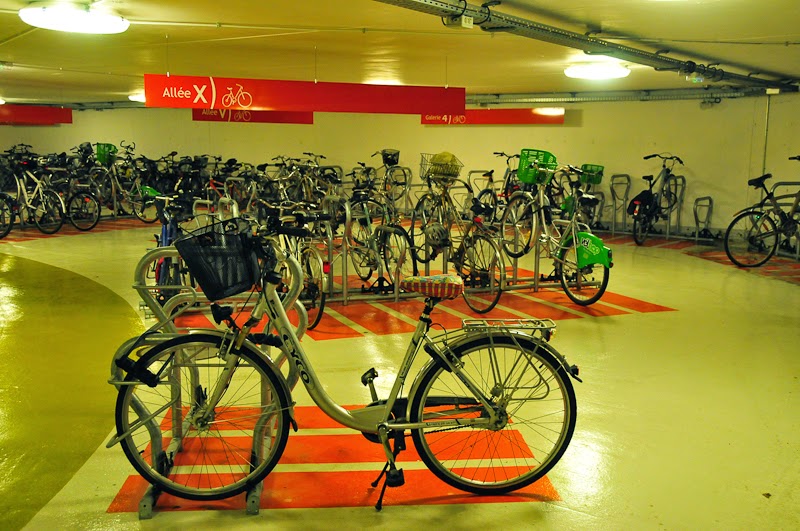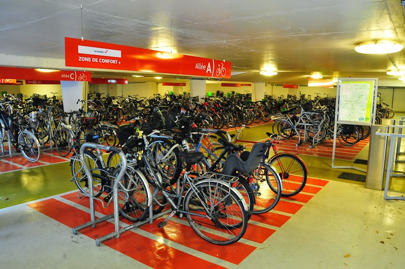 A l’instar de nombreuses autres villes en France ou à l'étranger, de nombreux passagers utilisent le vélo avant ou après leur trajet en train et le stationnent à proximité de la gare. Cependant dans une ville où 15 % des déplacements sont réalisés à vélo, la capacité de stationnement doit être dimensionnée en fonction de ces pratiques. Ainsi, il existe 4 zones de stationnement vélo à la gare. La première se situe en surface avec de nombreux arceaux disséminés sur la place de la gare qui proposent près de 800 places.