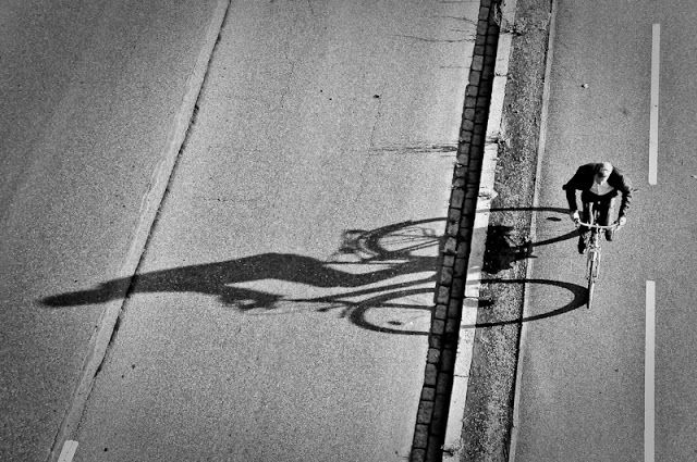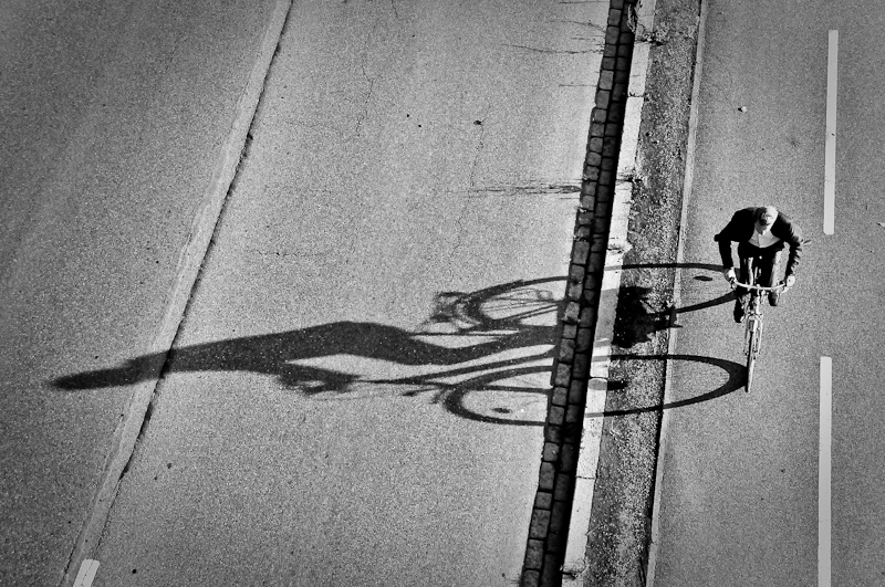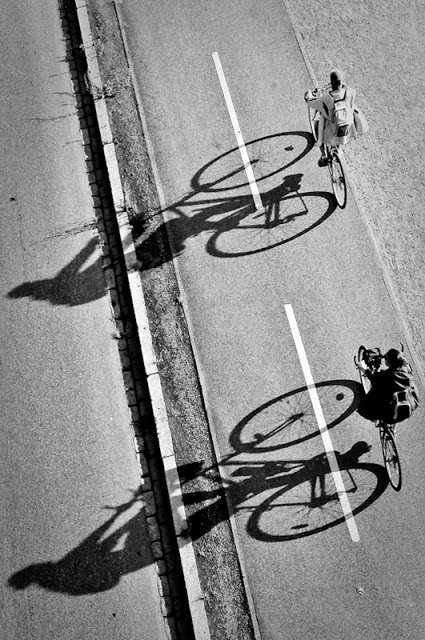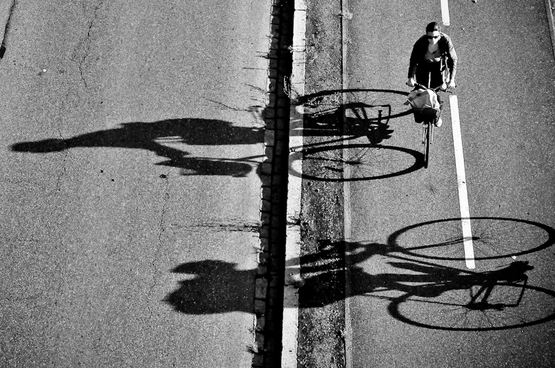 Ce traitement en noir et blanc ainsi qu'un travail fin d'amélioration du rendu des photos permet de renforcer le jeu de lumière et de mettre encore plus en valeur les magnifiques ombres des cyclistes dessinées par cette belle lumière matinale...