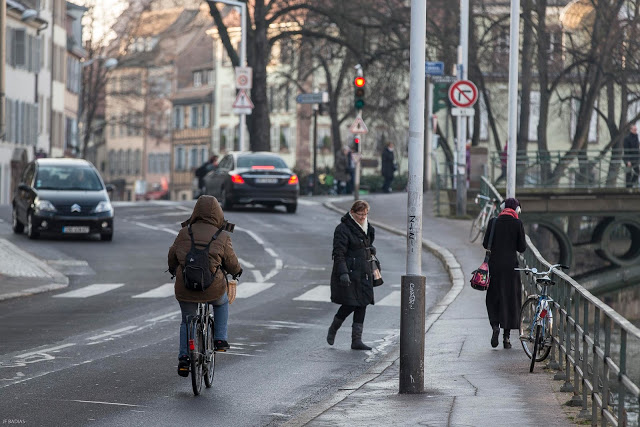 Restez donc poli et courtois si vous êtes gêné par des piétons. Ils ne connaissent peut être pas la ville et n'ont peut être pas l'habitude des cyclistes. Selon votre itinéraire cyclable, il sera plus rapide et confortable de contourner le centre ville surtout les après midi et le week end. Les quais Sud et Nord de l'Ill sont particulièrement adaptés pour éviter le centre ville lors de déplacements entre l'Est et l'Ouest de Strasbourg.