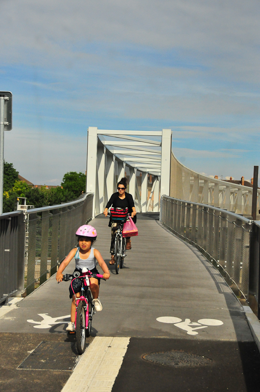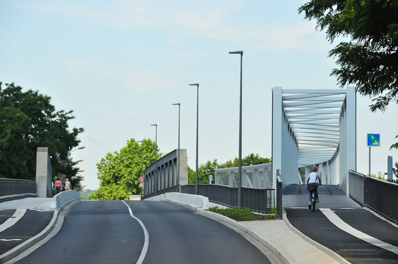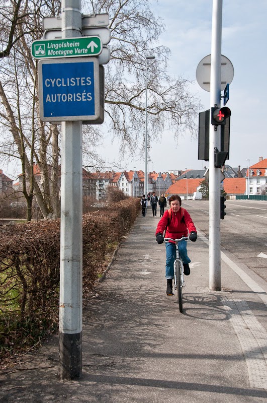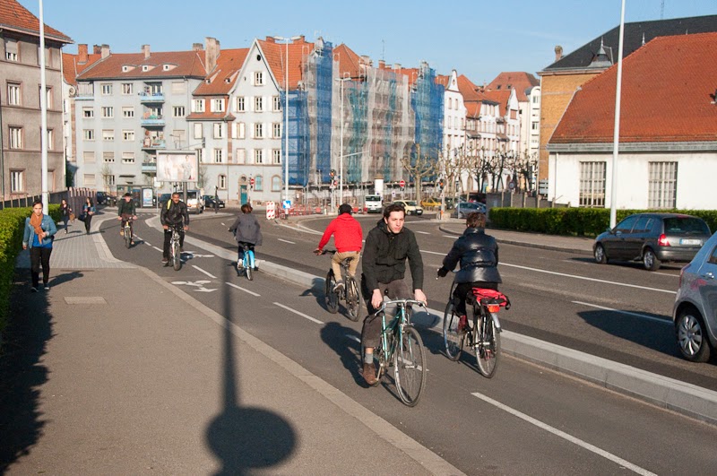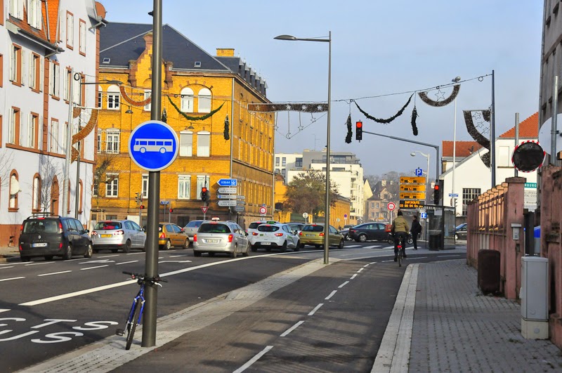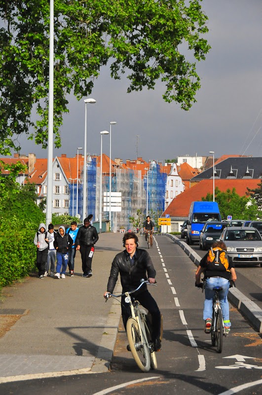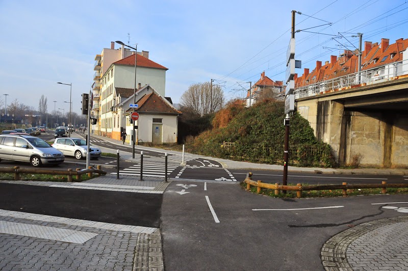 Cet aménagement d’un montant de 1,2 millions d’Euros qui a bénéficié d’un soutien financier du Conseil général du Bas-Rhin, consistait à aménager une piste cyclable bidirectionnelle en récupérant une voie de circulation automobile. Cet aménagement a également permis la suppression d’un espace mixte (trottoir sur lequel les cyclistes étaient autorisés à circuler) pour lesquels la Ville de Strasbourg a été condamnée en 2012 par le tribunal administratif, où la cohabitation entre les 4000 cyclistes par jour et les nombreux piétons fréquentant les équipements voisins (collège, lycée, mosquée) était très conflictuelle.