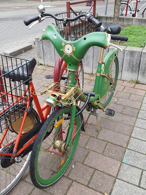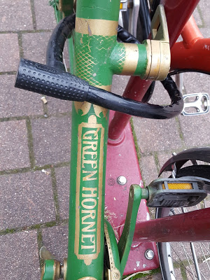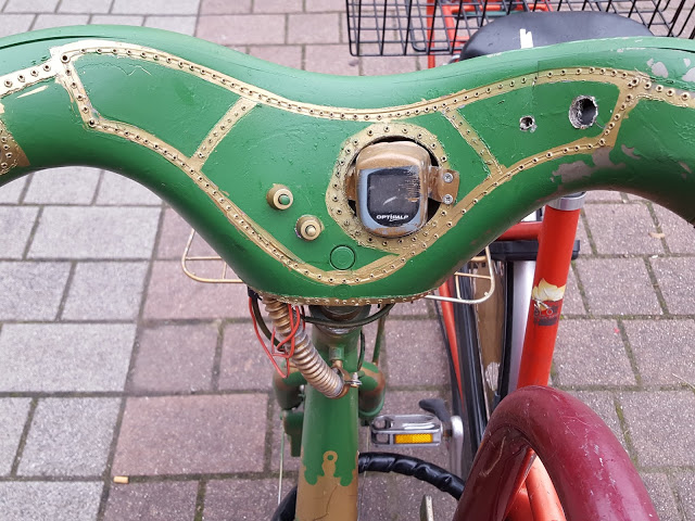 Il arbore tout d’abord une nouvelle livrée vert et or. Tous les éléments du vélo ont été peints avec ces couleurs. Les rayons, les jantes, le tube de selle, les garde boues, les manivelles, le carter, le guidon… La personnalisation ou devrais-je plutôt dire le maquillage, est allé jusqu’à retravailler le garde boue arrière pour lui donner un effet dentelé et à découper le carénage du guidon pour y insérer un compteur et deux boutons.