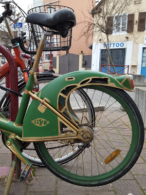 L’année 2017 commence fort avec une exclusivité! Il y a quelques jours, mon œil a repéré un vélo aux couleurs étranges mais au style pourtant connu. Il était parqué à Schiltigheim, seconde commune la plus peuplée de l’agglomération strasbourgeoise. Quelle ne fut pas ma surprise quand en me rapprochant, je reconnu, grâce à son garde boue différent des autres systèmes Cyclocity similaires de JC Decaux, un Vélib semblant être tout droit sorti de l’émission américaine de modifications d’automobiles « Pimp my ride ».